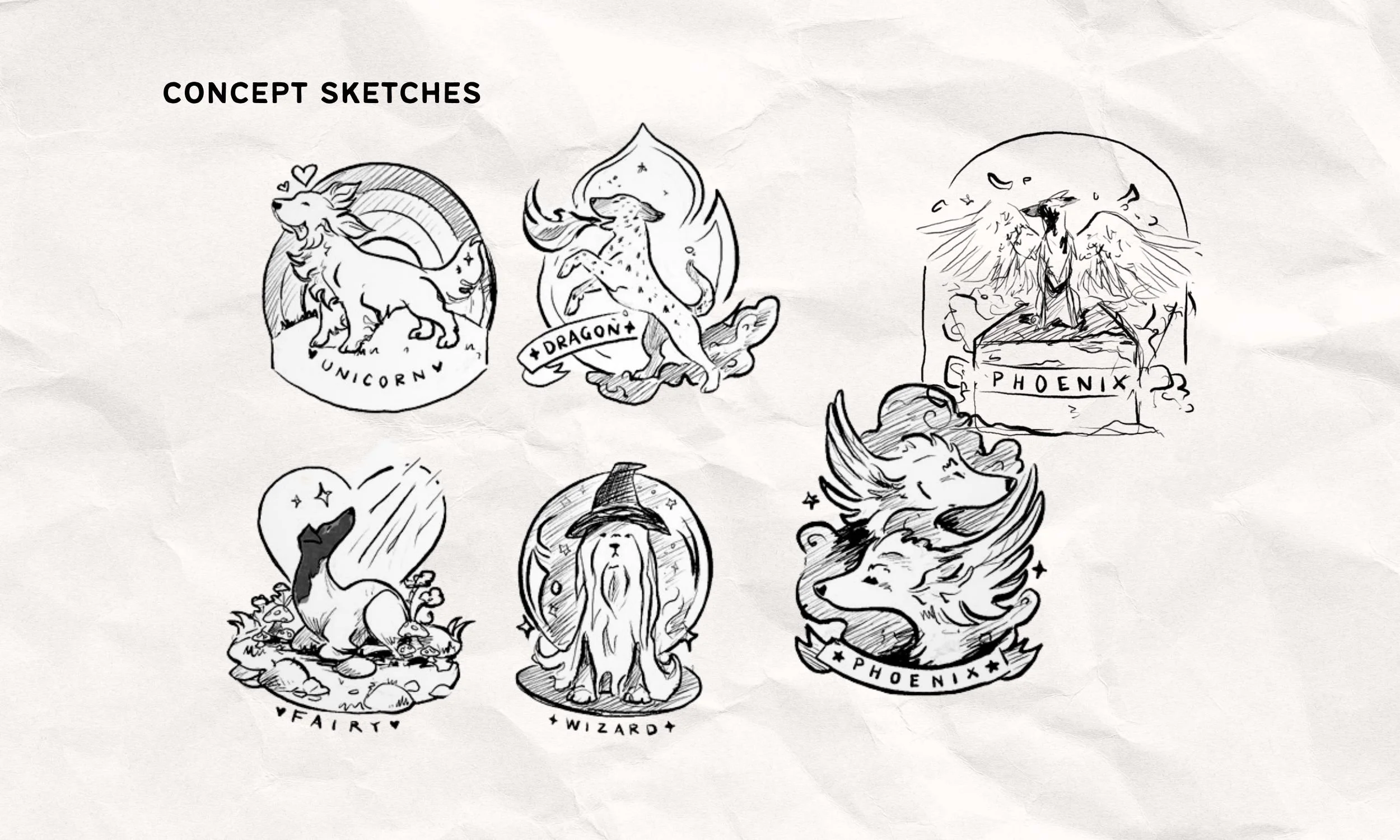 The first concept sketches landed for most of the illustrations! We switched out the unicorn retriever to a poodle, making the horn out of banded poodle hair - a cute nod to the dog show realm, which Tarin is a part of (exhibiting rare Japanese Terriers, included in the Fairy Guild illustration)